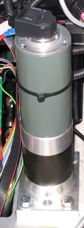 الأسطوانة الرمادية/الخضراء هي محرك تيار مستمر بنوع فرشاة. الجزء الأسود في الأسفل يحتوي على مخفض الحركة الدوار، والجسم الأسود على أعلى المحرك هو المُشفر البصري الدوار للتغذية الراجعة للموضع. وهو مُحرِّك القيادة والتوجيه لمركبة روبوتية كبيرة.