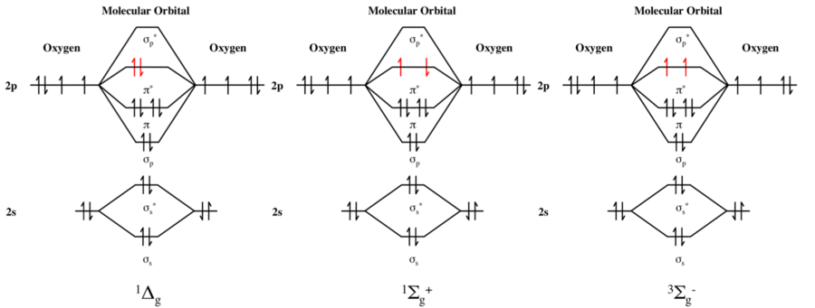 Singlet oxygen refers to one of two singlet electronic excited states. The two singlet states are denoted 1Σ+g and 1Δg (the preceding superscript "1" indicates a singlet state). The singlet states of oxygen are 158 and 95 kilojoules per mole higher in energy than the triplet ground state of oxygen. Under most common laboratory conditions, the higher energy 1Σ+g singlet state rapidly converts to the more stable, lower energy 1Δg singlet state.[2] This more stable of the two excited states has its two valence electrons spin-paired in one π* orbital while the second π* orbital is empty. This state is referred to by the title term, singlet oxygen, commonly abbreviated 1O2, to distinguish it from the triplet ground state molecule, 3O2.[2][3]