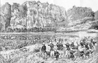 محاولات ريڤييه إنقاذ مدفع فرنسي عالق أثناء معركة جسر الورق. (19 مايو 1883)