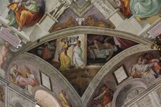 The ceiling at the chapel's four corners forms a doubled spandrel painted with salvific scenes from the Old Testament: The Brazen Serpent, The Crucifixion of Haman, Judith and Holofernes, and David and Goliath.[14] On the crescent-shaped areas, or lunettes, above each of the chapel's windows are tablets listing the ancestors of Christ and accompanying figures. Above them, in the triangular spandrels, a further eight groups of figures are shown, but these have not been identified with specific biblical characters. The scheme is completed by four large corner pendentives, each illustrating a dramatic biblical story.[36]