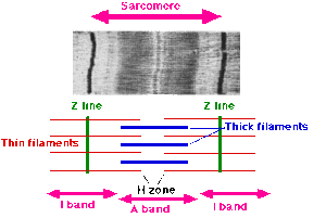 وتتكون الخيوط الرفيعة – 5 أنجستروم في القطر ، 2 ميكرومتر في الطول – من تركيب يعرف بإسم الأكتين Actin، وهي تتكون من الشرائط I وتمتد إلى الشرائط A حتى النطاق H. وتتكون الخيوط السميكة – 100 أنجستروم في القطر ، 1.5 ميكرومتر في الطول – من بروتين يعرف بإسم "ميوسين Myosin". وتمتد الخيوط السميكة متوازية في الشرائط “A” ، وتتداخل الخيوط السميكة مع الخيوط الرفيعة معا وفقا لنظام خاص. وعلى ذلك فإن طرازي الخيوط العضلية يختلفان معا في أبعادهما وتركيبهما الكيميائي. وتبود الشرائط “I” مضيئة ، لأنها تمثل المناطق التي لا تتراكب فيها الخيوط السميكة والرفيعة فوق بعضها البعض ، أي إنها تحتوي على طراز واحد من الخيوط. ويبدو الشرط “A” معتما لأنه يمثل المنطقة التي تتراكب فيها الخيوط السميكة والرفيعة بعضها فوق بعض ، أي إنها تحتوي على الطرازين من الخيوط.