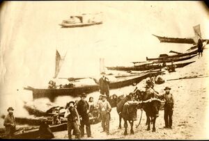 Canoes with settlers and Native Americans at Mukilteo Beach, ح. 1861–62