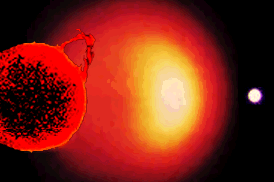 Artist's conception of the future evolution of our Sun. Left: main sequence; middle: red giant; right: white dwarf