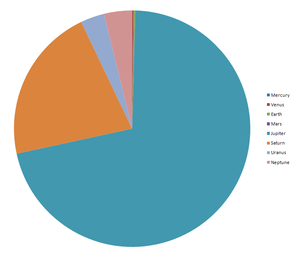 The relative masses of the Solar planets. Jupiter at 71% of the total and Saturn at 21% dominate the system. Mercury and Mars, which together are less than 0.1%, are not visible at this scale.