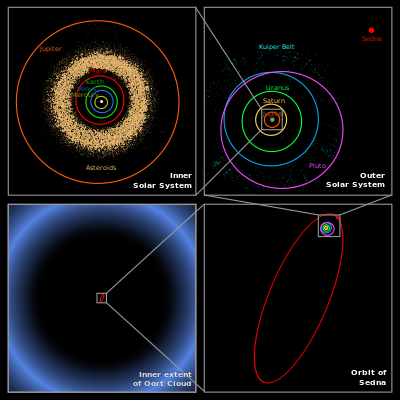 2. ^ The mass of the Solar System excluding the Sun, Jupiter and Saturn can be determined by adding together all the calculated masses for its largest objects and using rough calculations for the masses of the Oort cloud (estimated at roughly 3 Earth masses),[3] the Kuiper Belt (estimated at roughly 0.1 Earth mass)[4] and the asteroid belt (estimated to be 0.0005 Earth mass)[5] for a total, rounded upwards, of ~37 Earth masses, or 8.1 percent the mass in orbit around the Sun.