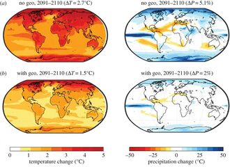 Models indicate that SRM would reverse warming-induced changes to precipitation more effectively than changes to temperature.[6] Therefore, using SRM to fully return global mean temperature to a preindustrial level would overcorrect for precipitation changes. This has led to claims that it would dry the planet or even cause drought,[38][بحاجة لمصدر] but this would depend on the intensity (i.e. radiative forcing) of SRM. Furthermore, soil moisture is more important for plants than average annual precipitation. Because SRM would reduce evaporation, it more precisely compensates for changes to soil moisture than for average annual precipitation.[6]