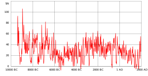 Sunspot numbers over the past 11,400 years have been reconstructed using Carbon-14-based dendroclimatology. The level of solar activity beginning in the 1940s is exceptional – the last period of similar magnitude occurred around 9,000 years ago (during the warm Boreal period).[6][7][8] The Sun was at a similarly high level of magnetic activity for only ~10% of the past 11,400 years. Almost all earlier high-activity periods were shorter than the present episode.[7] Fossil records suggest that the Solar cycle has been stable for at least the last 700 million years. For example, the cycle length during the early Permian is estimated to be 10.62 years[9] and similarly in the Neoproterozoic.[10][11]