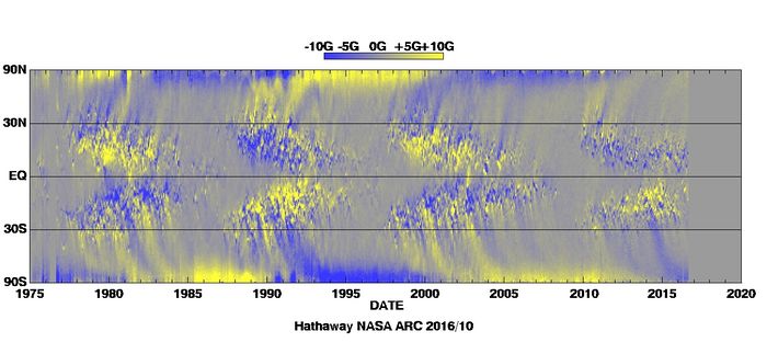 Time vs. solar latitude diagram of the radial component of the solar magnetic field, averaged over successive solar rotation. The "butterfly" signature of sunspots is clearly visible at low latitudes. Diagram constructed (and regularly updated) by the solar group at NASA Marshall Space Flight Center.
