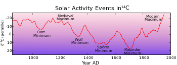 Solar activity events recorded in radiocarbon. Present period is on right. Values since 1900 not shown.