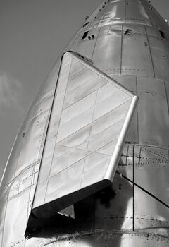 Starship controls its reentry with four flaps, two aft flaps mounted to the sides of the engine bay and LOX tank and two forward flaps on the payload bay.[66] Substantial reinforcements are present in the nosecone for the support of the forward flaps.[27] According to SpaceX, the flaps replace the need for wings or tailplane, reduce the fuel needed for landing, and allow landing at destinations in the Solar System where runways do not exist (for example, Mars). The flap's hinges are sealed in aerocovers because they would otherwise be easily damaged during reentry.[2] Static wicks are present on the flaps, aiding in the discharge of static electricity.[61]