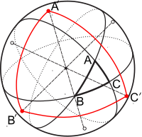 The polar triangle associated with a triangle ABC is defined as follows. Consider the great circle that contains the side BC. This great circle is defined by the intersection of a diametral plane with the surface. Draw the normal to that plane at the centre: it intersects the surface at two points and the point that is on the same side of the plane as A is (conventionally) termed the pole of A and it is denoted by A′. The points B′ and C′ are defined similarly.