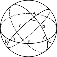 - The angle A (respectively, B, C) may be regarded either as the angle between the two planes that intersect the sphere at the vertex A, or, equivalently, as the angle between the tangents of the great circle arcs where they meet at the vertex.
