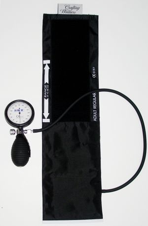 مقياس ضغط الدم sphygmomanometer (تــُنطـَق /ˌsfɪɡmoʊməˈnɒmɨtər/ SFIG-moh-mə-NOM-i-tər) أو جهاز قياس الضغط هو جهاز يستخدم لقياس ضغط الدم، ويتكون قياس ضغط الدم من رقمين مثلا 120 /80. ويشير الأول إلى الضغط الانقباضي، والثاني إلى الضغط الانبساطي. وعادة ما يكون الضغط الانقباضي 120 ملم للكبار. ويعتبر بعض الأطباء الضغط الذي يزيد عن 140 ملم عاليًا. ويعتبرون أيضًا الضغط الانبساطي الذي يزيد عن 90 ملم عاليًا. ويعتقد أطباء آخرون أن قراءة تزيد على 150/95 تشير إلى ضغط دم عال. وتُؤدي الانفعالات الشديدة، مثل الغضب والخوف، إلى ارتفاع مؤقت في ضغط الدم. والصدمة القوية يمكن أن تحدث هبوطًا حادًا في ضغط الدم.[1]