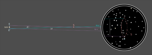 The plane of Earth’s orbit is at an angle to a line from the Sun through S. The vertices v and v' of the elliptical projection of the path of S are projections of positions of Earth E and E’ such that a line E-E’ intersects the line Sun-S at a right angle; the triangle created by points E, E’ and S is an isosceles triangle with the line Sun-S as its symmetry axis.