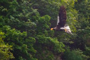 Steller's sea eagles are classified as vulnerable by the IUCN. They are legally protected, being classified as a national treasure in Japan and mostly occurring in protected areas in Russia, but many threats to their survival persist. These mainly include habitat alteration, industrial pollution, and overfishing, which in turn decrease their prey source. The current population is estimated at 5,000 and decreasing.[1] Heavy flooding, which may have been an effect of global climate change, caused almost complete nesting failure for the eagles nesting in Russian rivers due to completely hampering the ability of the parents to capture the fish essential to their nestlings' survival.[57] Persecution of the bird in Russia continues, due to its habit of stealing furbearers from trappers.[14] Due to a lack of other accessible prey in some areas, increasingly, eagles on Hokkaido have moved inland and scavenged on sika deer carcasses left by hunters, exposing them to a risk of lead poisoning through ingestion of lead shot.[72]
