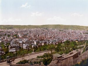 Stuttgart's literary tradition also bore yet more fruits, being the home of such writers of national importance as Wilhelm Hauff, Ludwig Uhland, Gustav Schwab, and Eduard Mörike.[71] From 1841 to 1846, the Jubiläumssäule was erected on the Schlossplatz before the New Palace according to the plans of Johann Michael Knapp to celebrate the rule of King Wilhelm I.[72] A decade later, the Königsbau was constructed by Knapp and court architect Christian Friedrich von Leins as a concert hall.[73] Another milestone in Stuttgart's history was the running of the first rail line from Cannstatt to Untertürkheim on 22 October 1845. The advent of Industrialisation in Germany heralded a major growth of population for Stuttgart: In 1834, Stuttgart counted 35,200 inhabitants,[74] rose to 50,000 in 1852, 69,084 inhabitants in 1864,[74] and finally 91,000 residents in 1871.[74] By 1874, Stuttgart once again exceeded the 100,000 inhabitant mark. This number doubled, due to the incorporation of local towns, to approximately 185,000 in 1901 and then 200,000 in 1904. In 1871, Württemberg joined the German Empire created by Otto von Bismarck, Prime Minister of Prussia, during the Unification of Germany, as an autonomous kingdom.