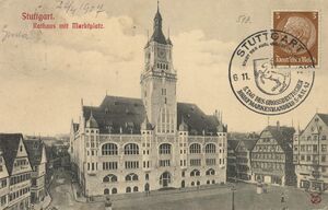 The Hotel Silber (إنگليزية: Silver), previously occupied by other forms of political police, was occupied by the Gestapo in 1933 to detain and torture political dissidents.[88] The hotel was used for the transit of Nazi prisoners of conscience including Eugen Bolz, Kurt Schumacher, and Lilo Herrmann to concentration camps. The nearby court at Archive Street (ألمانية: Archivstraße) 12A was also used as a central location for executions in Southwest Germany, as the headstone located in its atrium dedicated to the 419 lives lost there recalls.[89] Participants of the Kristallnacht burned the Old Synagogue to the ground[90] along with the relics contained within and also destroyed its Jewish cemetery.[91] The next year the Nazi regime began the arrests and deportation of Stuttgart's Jewish inhabitants, beginning with the entire male Jewish population of Stuttgart, to the police-run prison camp at Welzheim or directly to Dachau.[92] Other Jews from around Württemberg were brought to Stuttgart and housed in the ghetto on the former Trade Fair grounds in Killesberg. As the Memorial at Stuttgart North records,[93] between 1941 (the first train arrived 1 December 1941, and took around 1,000 men to Riga) and 1945, more than 2,000 Jews from all over Württemberg[93] were deported to Theresienstadt, Auschwitz, and the ghettos at Riga and Izbica. Of them, only 180 held in Internment survived the Shoah.[94][95]