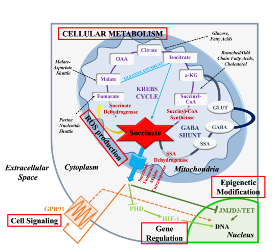 In addition to its metabolic roles, succinate serves as an intracellular and extracellular signaling molecule.[5][26] Extra-mitochondrial succinate alters the epigenetic landscape by inhibiting the family of 2-oxogluterate-dependent dioxygenases.[26] Alternative, succinate can be released into the extracellular milieu and the blood stream where it is recognized by target receptors.[30] In general, leakage from the mitochondria requires succinate overproduction or underconsumption and occurs due to reduced, reverse or completely absent activity of SDH or alternative changes in metabolic state. Mutations in SDH, hypoxia or energetic misbalance are all linked to an alteration of flux through the TCA cycle and succinate accumulation.[5][26][31] Upon exiting the mitochondria, succinate serves as a signal of metabolic state, communicating to neighboring cells how metabolically active the originating cell population is.[26] As such, succinate links TCA cycle dysfunction or metabolic changes to cell-cell communication and to oxidative stress-related responses.
