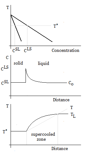 The liquidus slope from the binary phase diagram is given by , so the constitutional supercooling criterion for a binary alloy can be written in terms of the concentration gradient at the interface:
