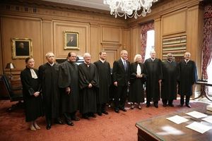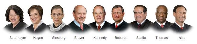 الصف الخلفي (من اليسار إلى اليمين): سونيا سوتومايور، ستيفن براير، صاموِل آليتو، وإلـِنا كـِگان. الصف الأمامي (من اليسار إلى اليمين): كلارنس توماس، أنتونين سكاليا، رئيس القضاة جون روبرتس، أنتوني كندي، وروث بادر گينزبرگ