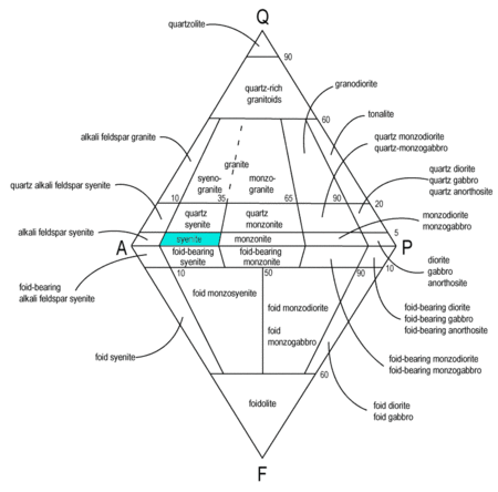 QAPF diagram that shows the quartz (Q), alkali feldspar (A), and plagioclase (P) composition of syenite