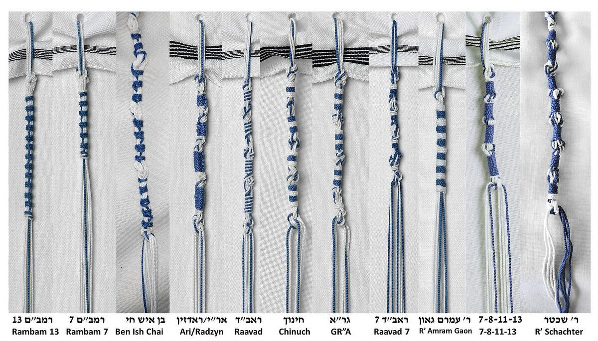 Abraham ben David holds that one full string should be blue, and there should be four groups of at least seven coils alternating between white and blue, both beginning and ending with blue.[88] There are multiple other opinions of how to tie the tzitzit if one full string is blue.