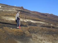 - ^ This is the broad definition of tephra (Greek tephra, "ash") اقترحها عالم البراكين الآيسلندي Sigurður Þórarinsson (Sigurdur Thorarinsson) في 1954، فيما يتعلق بثوران هكلا (Thorarinsson, "The eruption of Hekla, 1947-48II, 3, The tephra-fall from Hekla, March 29th, 1947", Visindafélag Íslendinga (1954:1-3).