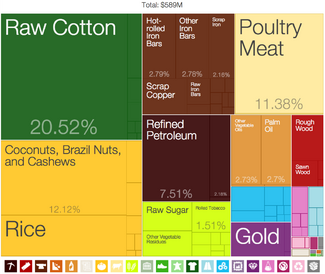 Products, represented by rectangles, are drawn from the 775 individual product classes found in the Standardized International Trade Code at the four-digit level (SITC-4). The rectangle's color corresponds to the 34 product communities found in the Product Space and other visualizations from The Observatory of Economic Complexity. Product Exports Treemaps in The Observatory of Economic Complexity graphically represent product's share of a nation's trade (imports or exports). The larger the size of the rectangle, the larger the product's share of that country's imports or exports.