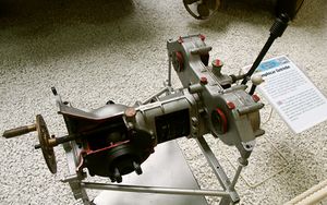 يصنع المحور (رقم 1) كتلة واحدة مع المسنن اللولبي (2)، الذي يتعشق باستمرار مع المسنن (12) على المحور الوسيط. يتوضع مسنن السرعة الأولى (5) على أخاديد المحور (6) ويستند مسنن السرعة الثانية (4) بحرية إلى جلبة مركبة على المحور (6)، ويحتوي على مخروط لتوصيل أداة التزامن. ويستند المحور (6) بدوره إلى مدرجة أسطوانية وأخرى كروية. ويدور المحور الوسيط (13) على مدرجتين، يتألف من كتلة بلحية من أربعة مسننات مسنن السرعة الأولى (7)، مسنن السرعة الثانية (9)، ومسنن السرعة الثالثة (10)، ومسنن التعشيق الدائم (12).