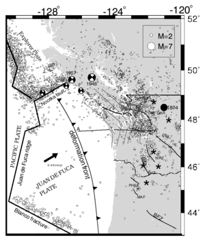 The Nootka Fault at the triple junction of the North American Plate, the Explorer Plate, and the Juan de Fuca