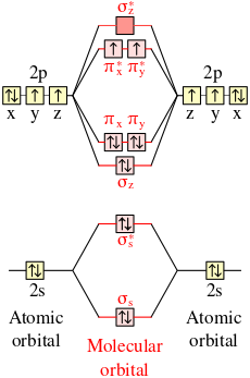 الأكسجين الثلاثي Triplet oxygen، 3O2, refers to the S = 1 electronic ground state of molecular oxygen (dioxygen). Molecules of triplet oxygen contain two unpaired electrons, making triplet oxygen an unusual example of a stable and commonly encountered diradical:[2] it is more stable as a triplet than a singlet. According to molecular orbital theory, the electron configuration of triplet oxygen has two electrons occupying two π molecular orbitals (MOs) of equal energy (that is, degenerate MOs). In accordance with Hund's rules, they remain unpaired and spin-parallel, which accounts for the paramagnetism of molecular oxygen. These half-filled orbitals are antibonding in character, reducing the overall bond order of the molecule to 2 from the maximum value of 3 that would occur when these antibonding orbitals remain fully unoccupied, as in dinitrogen. The molecular term symbol for triplet oxygen is 3Σ−g.[3]