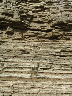 Turbidite interbedded with finegrained dusky-yellow sandstone and gray clay shale that occur in graded beds, Point Loma Formation, California.