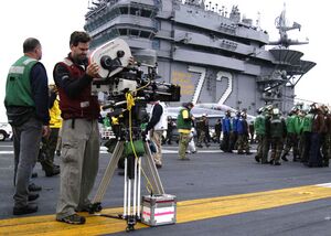 In June 2004, following a 10-month docking period, the ship put to sea for the start of working up prior to deployment. During this period, a film crew was hosted aboard to produce scenes for the film Stealth, which included the presence of a full-scale model of a fictional aircraft, the F/A-37 Talon, that would feature as operating from the carrier.[16] On 1 October 2004, the carrier's controlling formation was redesignated from Cruiser-Destroyer Group Three to Carrier Strike Group Nine. Abraham Lincoln departed for her next voyage on 15 October 2004.[17]
