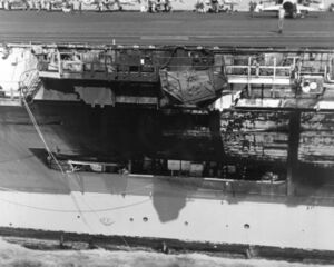 A view of damage sustained by the carrier John F. Kennedy when she collided with the cruiser USS Belknap