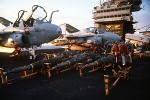 Laser-guided bombs line the flight deck of the aircraft carrier John F. Kennedy in preparation for air strikes against Iraq during Operation Desert Storm on 23 January 1991. The A-6E Intruder aircraft in the background is armed with laser-guided bombs.