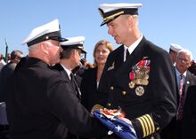 U.S. Navy Command Master Chief Charles L. Dassance presents the ensign to U.S. Navy Capt. Todd A. Zecchin, commanding officer of USS John F. Kennedy, during the ship's decommissioning ceremony.