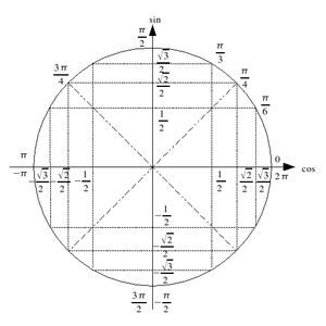 إذا كانت النقطة (x, y) هي نقطة على دائرة الوحدة، وكان الشعاع الذي مبدأ النقطة (0, 0) إلى النقطة (x, y) تشكل زاوية t مع محور x الموجب (حيث الاتجاه الموجب هو اتجاه عكس عقارب الساعة) عندها يكون:
