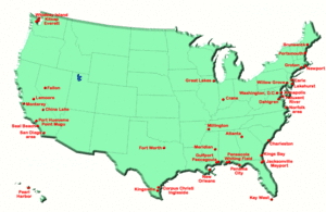 تقع قواعد الغواصات القوات البحرية الأمريكية الرئيسية على الساحل الشرقي في قاعدة الغواصة البحرية نيو لندن في گروتون، كنتيكت و قاعدة الغواصة البحرية كنگز باي في كنگز باي، جورجيا. ترسانة پورتسموث البحرية بالقرب من پورتسموث، نيو هامپشر،[62] مكان إصلاح الغواصات البحرية.[3] محطة البحيرات العظمى البحرية، شمال شيكاغو، إلينوي وهي موطن معسكر التدريب للبحارة المجندين.