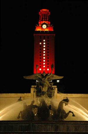 One of the university's most visible features is the Beaux-Arts Main Building, including a 307-قدم (94 m) tower designed by Paul Philippe Cret.[82] Completed in 1937, the Main Building is in the middle of campus. The tower usually appears illuminated in white light in the evening but is lit burnt orange for various special occasions, including athletic victories and academic accomplishments; conversely, it is darkened for solemn occasions.[83] At the top of the tower is a carillon of 56 bells, the largest in Texas. Songs are played on weekdays by student carillonneurs,[84] in addition to the usual pealing of Westminster Quarters every quarter-hour between 6 a.m. and 9 p.m.[85] In 1998, after the installation of security and safety measures, the observation deck reopened to the public indefinitely for weekend tours.[86]