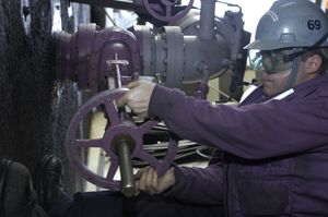 A sailor aboard a ship operates the wheel controlling a fuel valve.