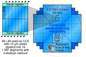 تم تجميع هذه الأجهزة في شبكة 5 × 5 "طوافة"، حيث تحتوي 21 طوفًا مركزيًا على مستشعرات تصوير 3x3، بينما تحتوي كل طوف زاوية أربعة على ثلاث أجهزة مقترنة الشحنة فقط للتوجيه والتحكم في التركيز. توفر أجهزة مقترنة الشحنة أفضل من 0.2 ثانية قوسية لأخذ العينات، وسيتم تبريدها إلى -100 درجة مئوية تقريبًا للمساعدة في تقليل الضوضاء.[40]