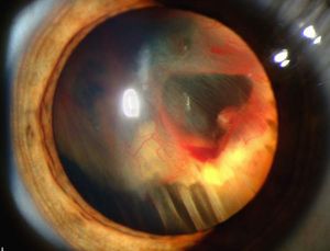 Slit lamp photograph showing retinal detachment with visible vitreous hemorrhage
