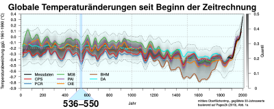 It was originally theorized that the climatic changes of AD 536 were caused by either volcanic eruptions (a phenomenon known as "volcanic winter") or impact events (meteorite or comet).[23][24][25]