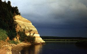 Vologda Oblast is located on the East European Plain, and most of it represents forested hilly landscape. The southwest of the oblast, along the Sheksna and the Mologa, is flat. The northwestern part is mostly of glacial origin, with the Andoma Hills, the Veps Hills, and a number of minor hill chains.[12] In the east of the oblast, the valleys of the Vaga, the Sukhona, and the Yug are cut through the hills. The southeast of the oblast is occupied by the Northern Ridge, which is located south of the valley of the Sukhona.