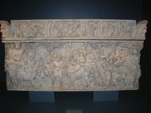 Roman marble sarcophagus depicting the Triumph of Bacchus returning from India, with soldiers atop war elephants, 2nd century AD, similar to a later sacrophagus with the same theme