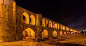 صورة جسر سی‌وسه‌پل في الليل وظهور نهر زاینده‌رود جاف.