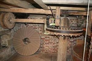 Model of a Roman water-powered grain-mill described by Vitruvius. The millstone (upper floor) is powered by a undershot waterwheel by the way of a gear mechanism (lower floor)