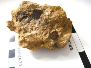 A freshly broken rock shows differential chemical weathering (probably mostly oxidation) progressing inward. This piece of sandstone was found in glacial drift near Angelica, New York