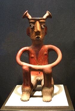 • Ceramic dogs are widely known from looted tombs in Colima. Dogs were generally believed in Mesoamerican cultures to represent soul guides of the dead[32] and several dog ceramics wear human masks.[33] Nonetheless, it should also be noted that dogs were often the major source of animal protein in ancient Mesoamerica.[34]
