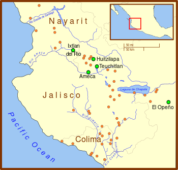 Western Mexico archaeological sites. The orange circles show archaeological sites. The larger green circles highlight the most important sites. Note that the sites form what has been called the "shaft tomb arc" which extends from northwest Nayarit through the central Jalisco highlands and down to Colima.